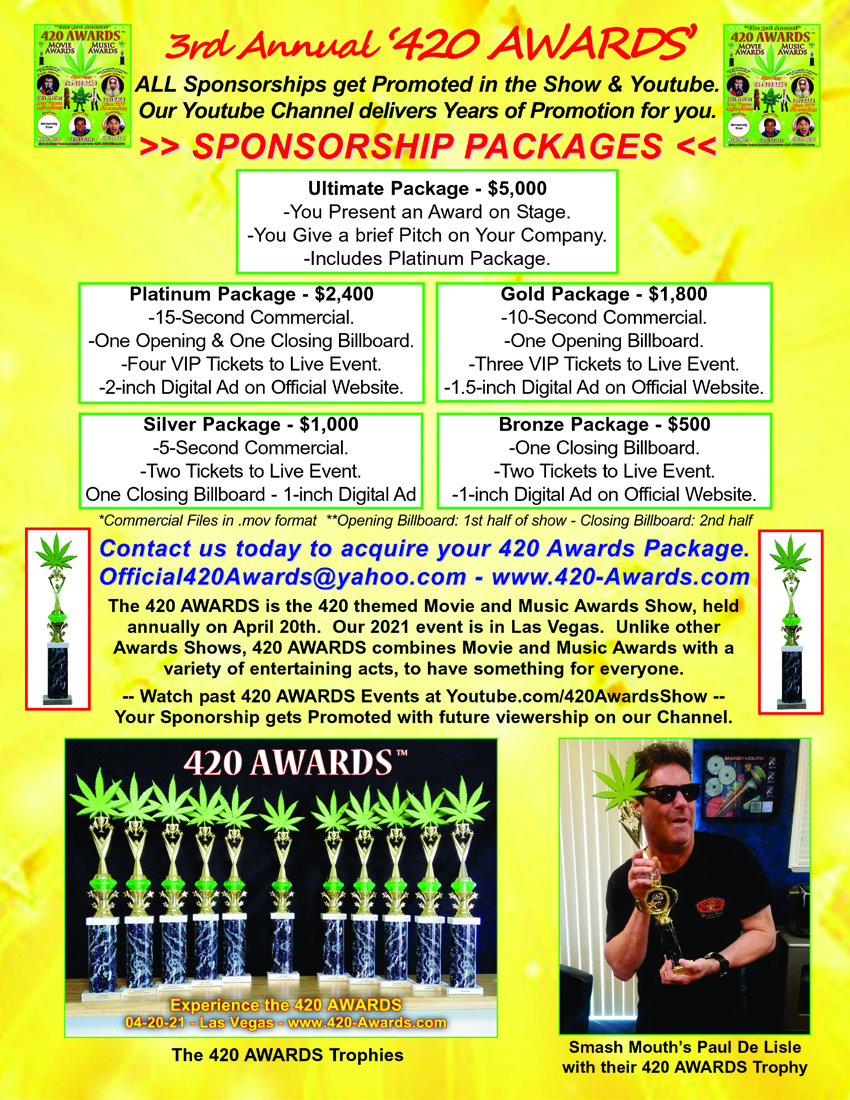 website. There are so many CBD and dispensaries, but they have one thing in common - if they don't get PR, they will fade away. And we can help deliver you PR to the 420 audience. A Beautiful thing about 420 AWARDS Sponsorships - this is NOT a One-Time promotion. Three weeks after the Stream date of 04-20-2021, the 3rd Annual 420 AWARDS will be posted on our Youtube channels. Our First Annual Event has over 90,000 views, so Sponsors will receive much ongoing promotion. Let us help promote your product. We're also happy to customize a special package for your needs. Watch the past 420 AWARDS Shows on our website ---CONTACT INFORMATION--- Just think of the Oscars and Golden Globes, and how cool it'd be to be part of them from the beginning. This is the 420 AWARDS. If interested in 420 AWARDS investments, please contact us at: 420