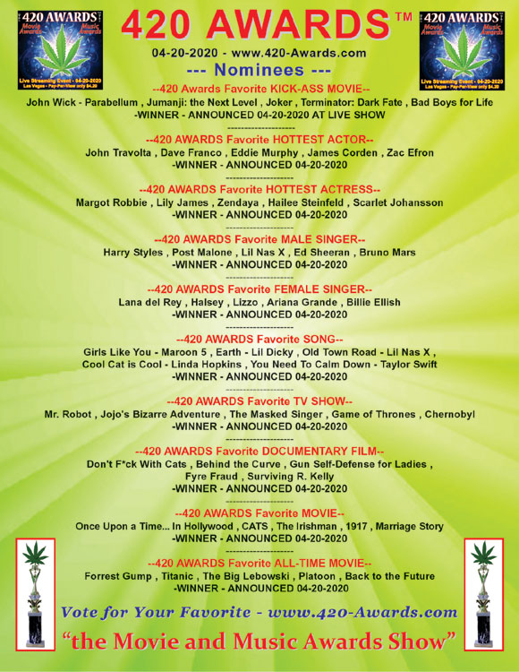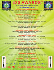 The 420 AWARDS is the '420 Themed Movie and Music Awards Show', aired annually on April 20th. Unlike other Awards Shows, 420 AWARDS combines both Movie and Music Awards, along with a variety of entertaining acts, to have something for everyone. The 420 AWARDS Nominees and Winners are voted for via online